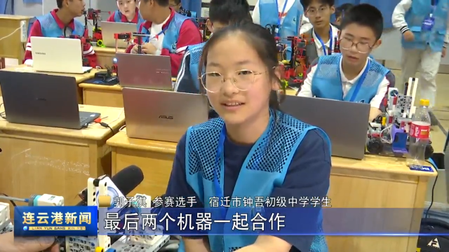 参赛选手 宿迁市钟吾初级中学学生郭子淇:我参加的是机器人B类,然后就是它要识别像这种方块,夹放到码垛区里,最后两个机器一起合作,然后共同完成任务。