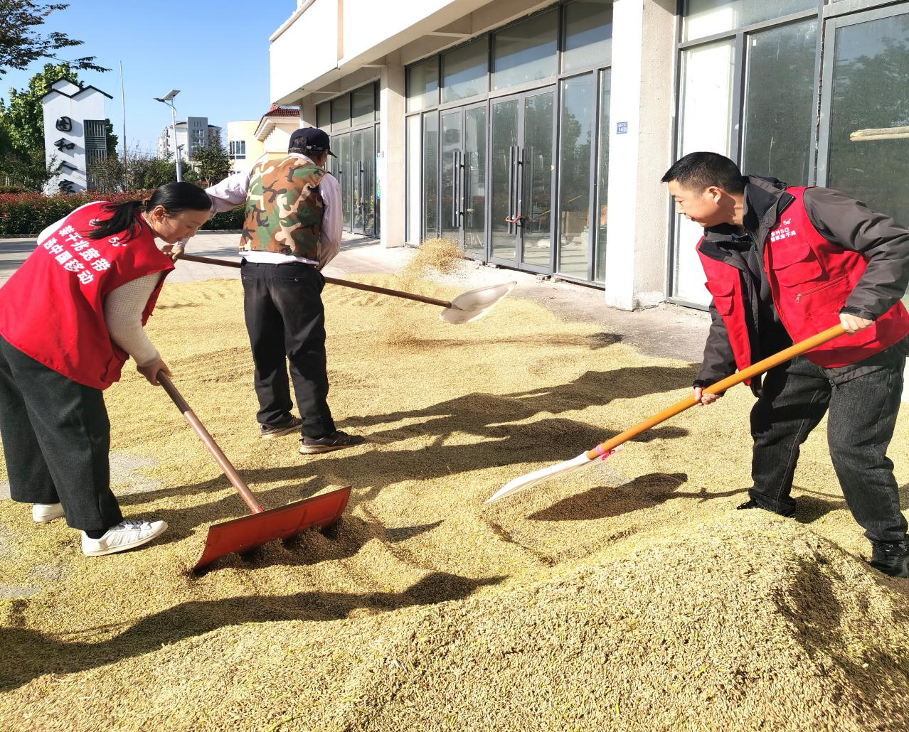 晒场上,志愿者们分工明确、协作高效:有的搬运粮袋,有的挥动锄头翻晒稻谷,全力加快晾晒进度。抢晒任务完成后,志愿者们还主动为农户手机上调试天气预报小程序,精准预判后续天气,手把手指导农户科学安排晾晒工作。