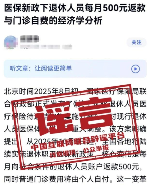 近日,有网民发布题为《医保新政下退休人员每月500元返款与门诊自费的经济学分析》的文章,声称“北京时间2025年8月初,国家医疗保障局联合财政部正式发布了《关于优化退休人员医疗保险待遇结构的实施方案》,对现行退休人员医保体系进行了重大调整”。经有关主管部门核查,国家医保局与财政部未发布过上述文件,文章所涉“从2025年10月1日起,全国各地将陆续实施退休职工医保新政策,每月向符合条件的退休人员账户返款500元,同时普通门诊费用将由个人自付”等内容均为谣言。