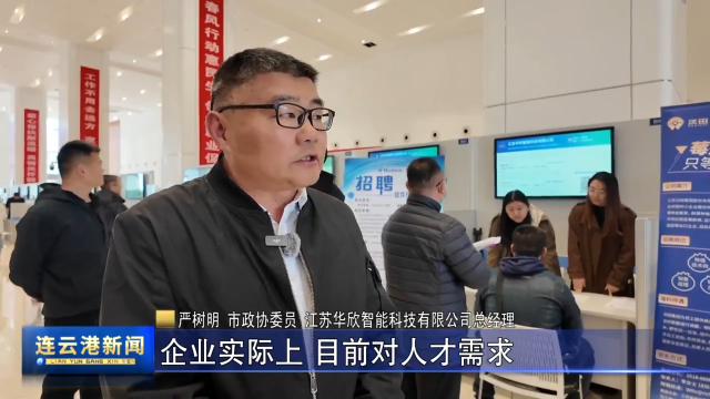 严树明 市政协委员、江苏华欣智能科技有限公司总经理:我们企业实际上对人才需求还是比较旺盛的,还是比较有要求的。因为我们现在对开发人才非常欠缺。通过这次招聘会,我们希望为我们企业能够实实在在招聘到我们需要的这种人才,来助力我们企业的发展,为我们企业增加新鲜血液。