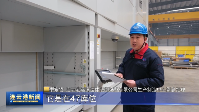 卞耀岱 连云港远洋流体装卸设备有限公司生产制造中心副总经理:我现在调取的是我们的一个项目,根据我的 ERP 的领调工单,它是在 47 库位,那我就调取一个 47 的库位,给大家操作一下。它现在就是在一个调取托盘的库位的一个缓冲区间,它马上出来,这个托盘已经调取完成。我所需要的物资就是在位置,就是根据我的简单进行核对,就可以进行一个收发领用。