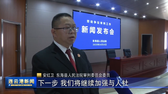 东海县人民法院审判委员会委员 安红卫:下一步,我们将继续加强与人社、仲裁等部门的协作配合,在诉前加强对企业用工的规范、法治宣传和培训,同时也进一步深化与仲裁等部门的协作配合,统一裁判尺度,进一步加强法治化营商环境的保护力度,同时也加强对劳动者合法权益的保护。