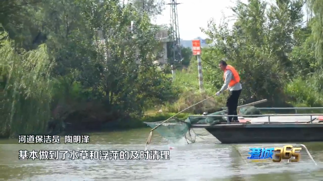 河道保洁员 陶明泽:今年装备实现了升级,船头加装了兜网用于捞浮萍,船尾配备了拖刀用来割水草,清理效率比去年提高了5倍,基本做到了水草和浮萍的及时清理。针对夏季水草生长旺盛的情况,我们增加了保洁频次,每月清理各类水生垃圾近800吨。