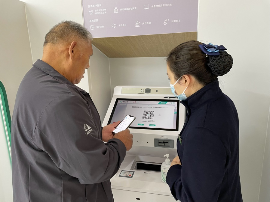 图:客服人员帮助老年客户使用智慧柜员机办理业务