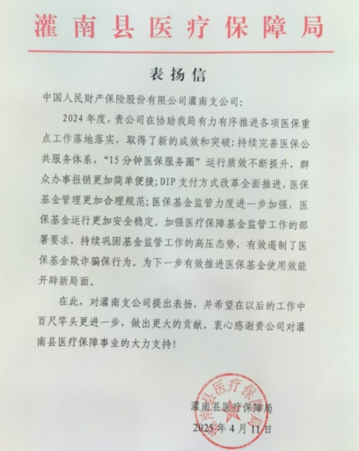 人保财险灌南支公司获表扬信,助力医保事业发展获肯定