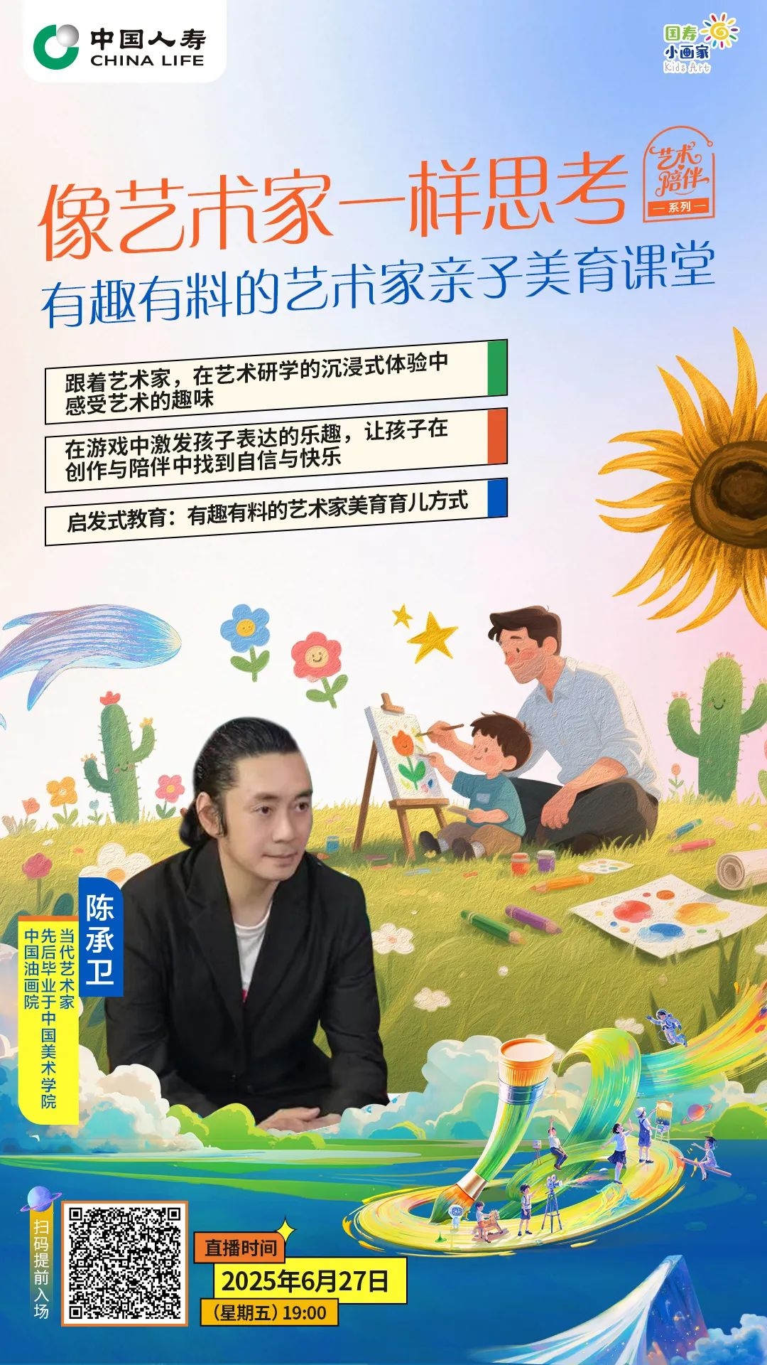 2025年6月27日19:00,“像艺术家一样育儿,有趣有料的艺术家亲子美育课堂”将邀请艺术家陈承卫和艺术萌娃小E,与大小朋友们一起,沉浸式在线逛展、亲子互动。不容错过的亲子美育课堂,艺术萌娃是如何养成的?等你来解锁!