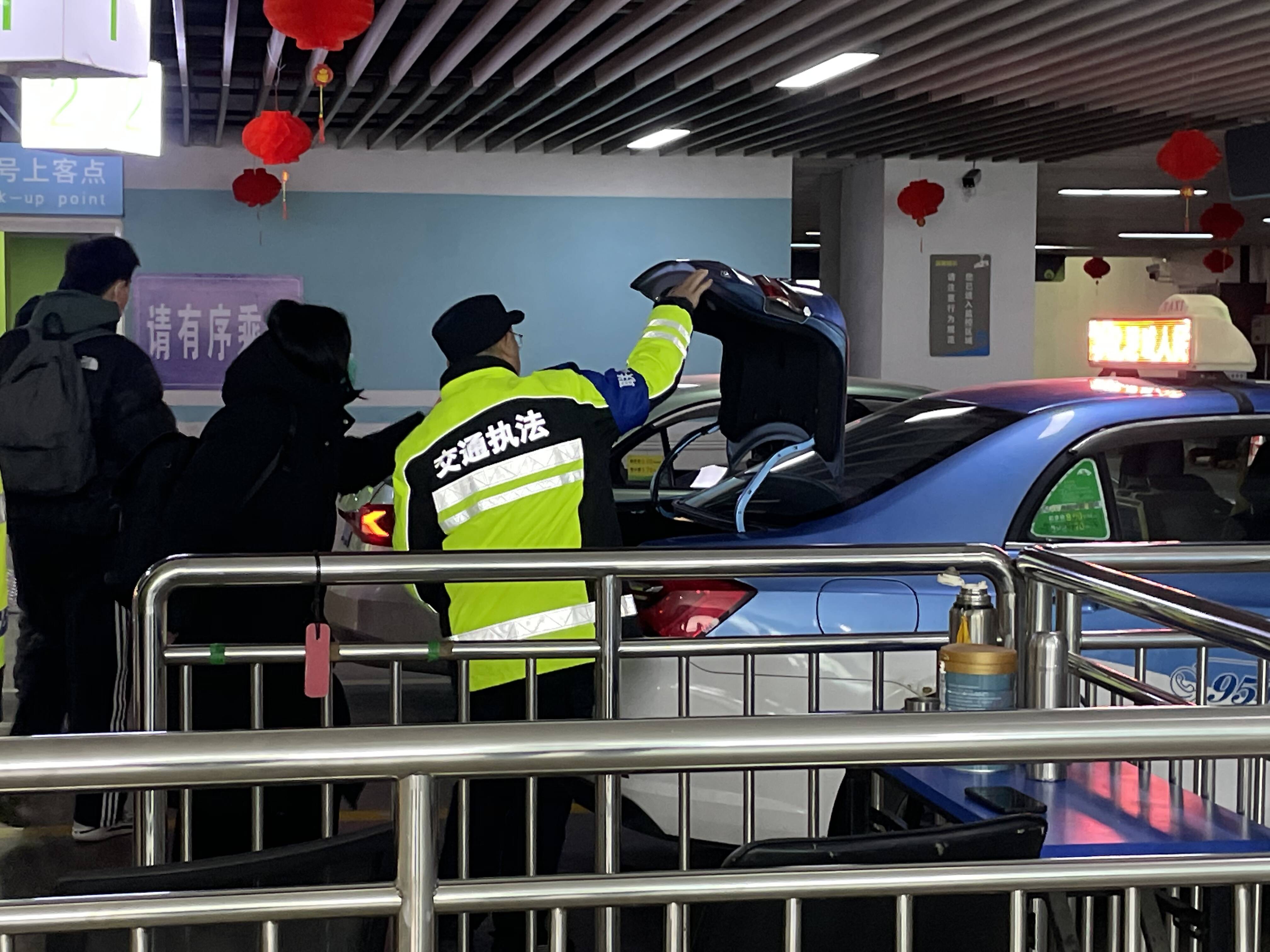在连云港高铁站,“青年突击队”的同志们定点值守,严厉打击非法营运车辆,对网约车、出租车进行严格监管,对拒载、甩客、强制拼客、不按规定使用计价器、违规收费等违法违规经营行为坚决说“不”。一线执法人员按照“早于第一班列车旅客到站、晚于最后一名旅客离站”的要求,在出站口、网约车候车点等处开展执法服务,对排队候客的出租车辆进行指挥管理,维持现场乘车秩序,保障乘客合法权益。