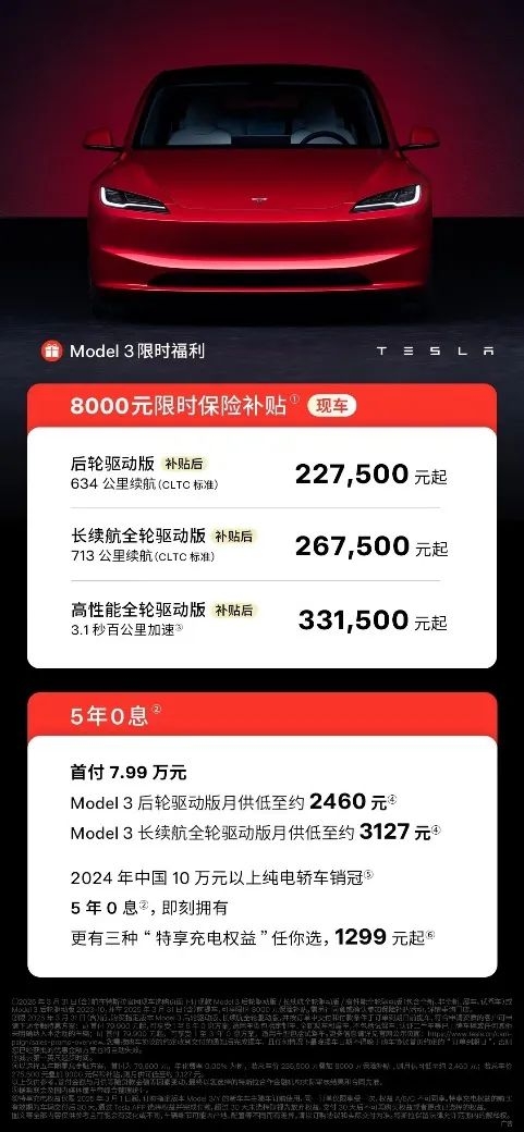 "连云港作为正在打造的国家级新能源产业基地。"特斯拉江苏区域工作人员表示,"连云港特斯拉中心将以海州区为核心,可辐射整个苏北地区,为广大本地市民及周边地区带来特斯拉全球直营的、高品质的购车、提车、用车一站式服务。"据悉,特斯拉已在江苏布局62家体验店和展厅、31家服务中心及189座超级充电站,而连云港中心的落成标志着特斯拉完成对江苏13个地级市的全覆盖。据悉,2025年“两新”政策加力扩围实施以来,汽车以旧换新火热开展。连云港市积极围绕促进消费持续夯基础、挖潜力、优结构,持续优化新能源汽车消费环境。今年2月,连云港市商务局发布了置换和新购补贴细则,通过精准补贴(如报废旧车置换新能源最高补2万元、二手车置换新能源最高补贴1.5万元),激活置换需求,为汽车消费市场注入强劲动能。特斯拉也推出了可叠加政府补贴的限时优惠补贴:3月31日前下单Model 3,即享限时保险补贴8000元;后轮驱动版或长续航全轮驱动版车型可叠加申请限时5年0息金融方案,也是特斯拉保险补贴首次覆盖Model 3全系车型(包括Model 3高性能版)。即日起到2025年3月31日(含)期间购买指定版本 Model Y后轮驱动版,加申请限时3年0息金融方案,首付79900元起,利息不花1分钱。另外,特享充电权益价1299元起,即可购买充电服务包,无论是家庭充电还是超级充电,让消费者充电无忧。据网友测算,现在购买Model 3比同价位燃油车至少省出5.6万。