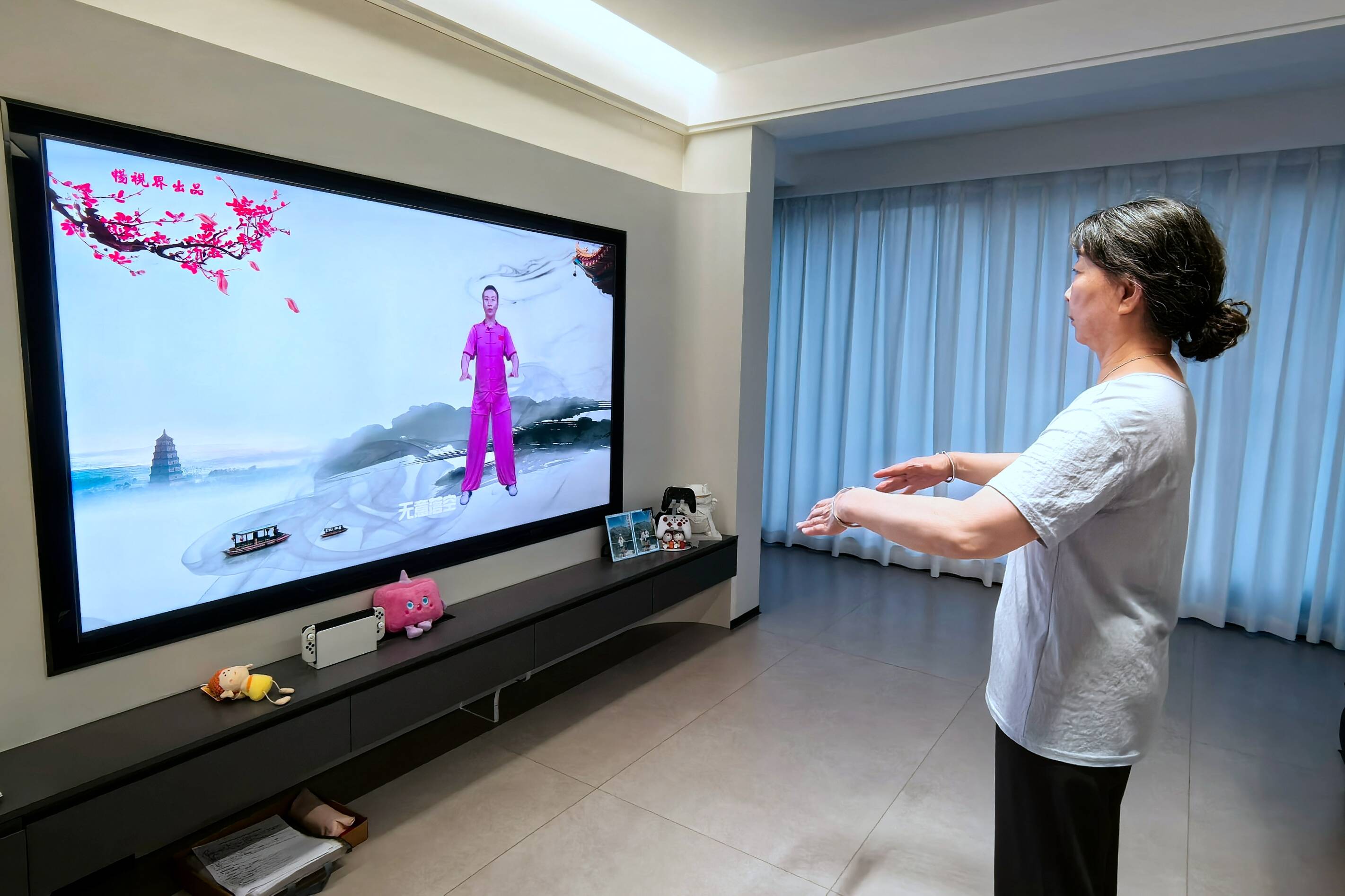 而在盐城,移动高清电视则让传统养生保健焕发出新生。陈奶奶一声“跳广场舞”,虚拟管家“灵犀”便出现在屏幕上,同步启动AI健身模式,手机摄像头与电视联动,实时捕捉她的动作,显示姿势是否正确。不多时,陈爷爷也来到了客厅,随着一句“继续播放杨氏太极”,电视秒切换,老两口开始跟着电视画面一起练习。