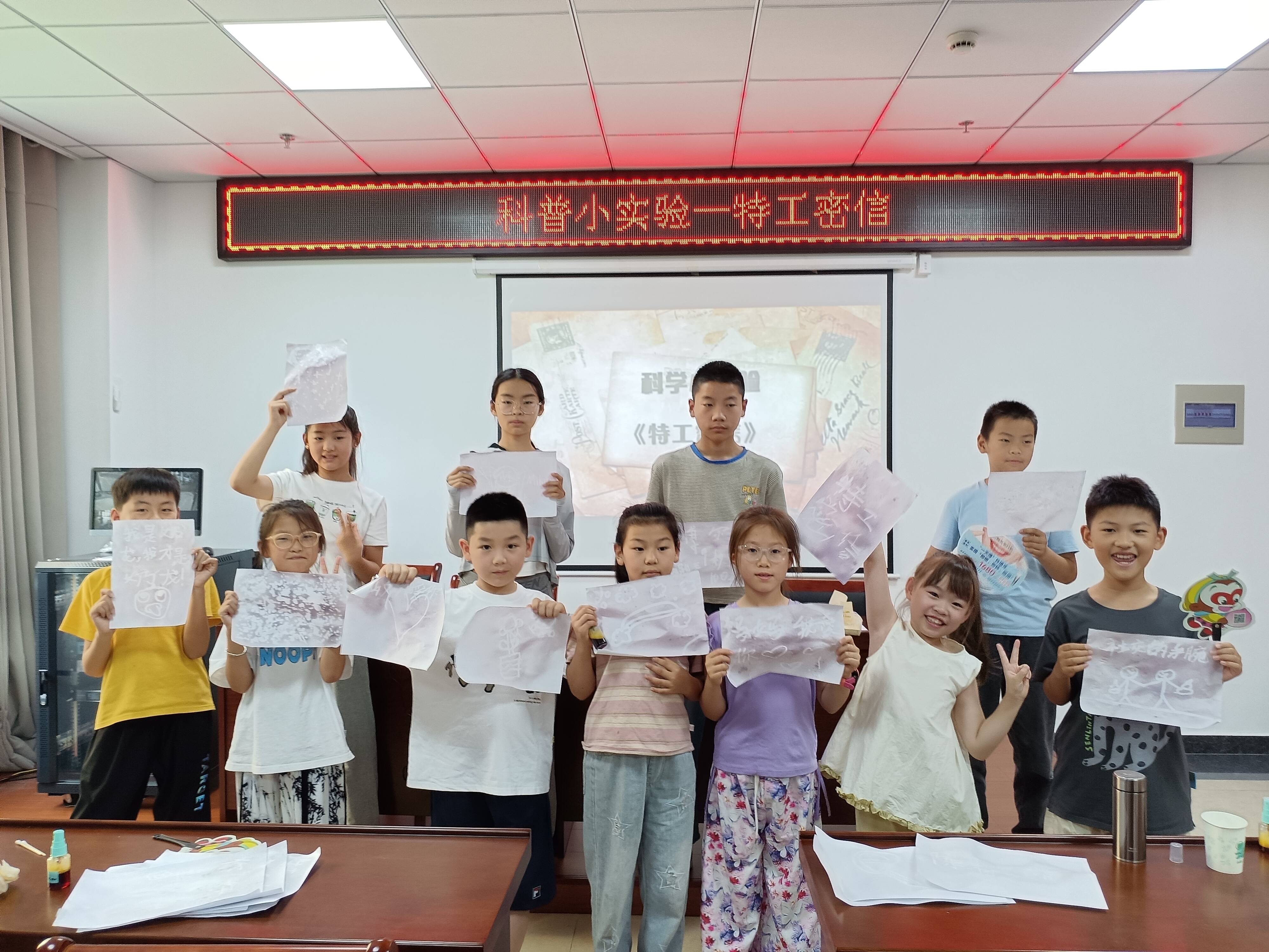 特工密信环节则用化学实验解锁科学密码。志愿者老师以“特工任务”为情境,带领孩子们用维C制作“隐形墨水”,当喷洒碘伏后文字逐渐显现,孩子们惊叹于化学变化的神奇。同时,孩子们分组设计“摩斯密码”“镜像字”等密信,并交换破解,他们结合刚学的酸碱反应知识,用紫甘蓝汁检测“密信”中的隐藏信息,在合作中感受科学探索的乐趣。有孩子开心表示:“原来科学这么酷!我要回家试试用苏打水写密信!”