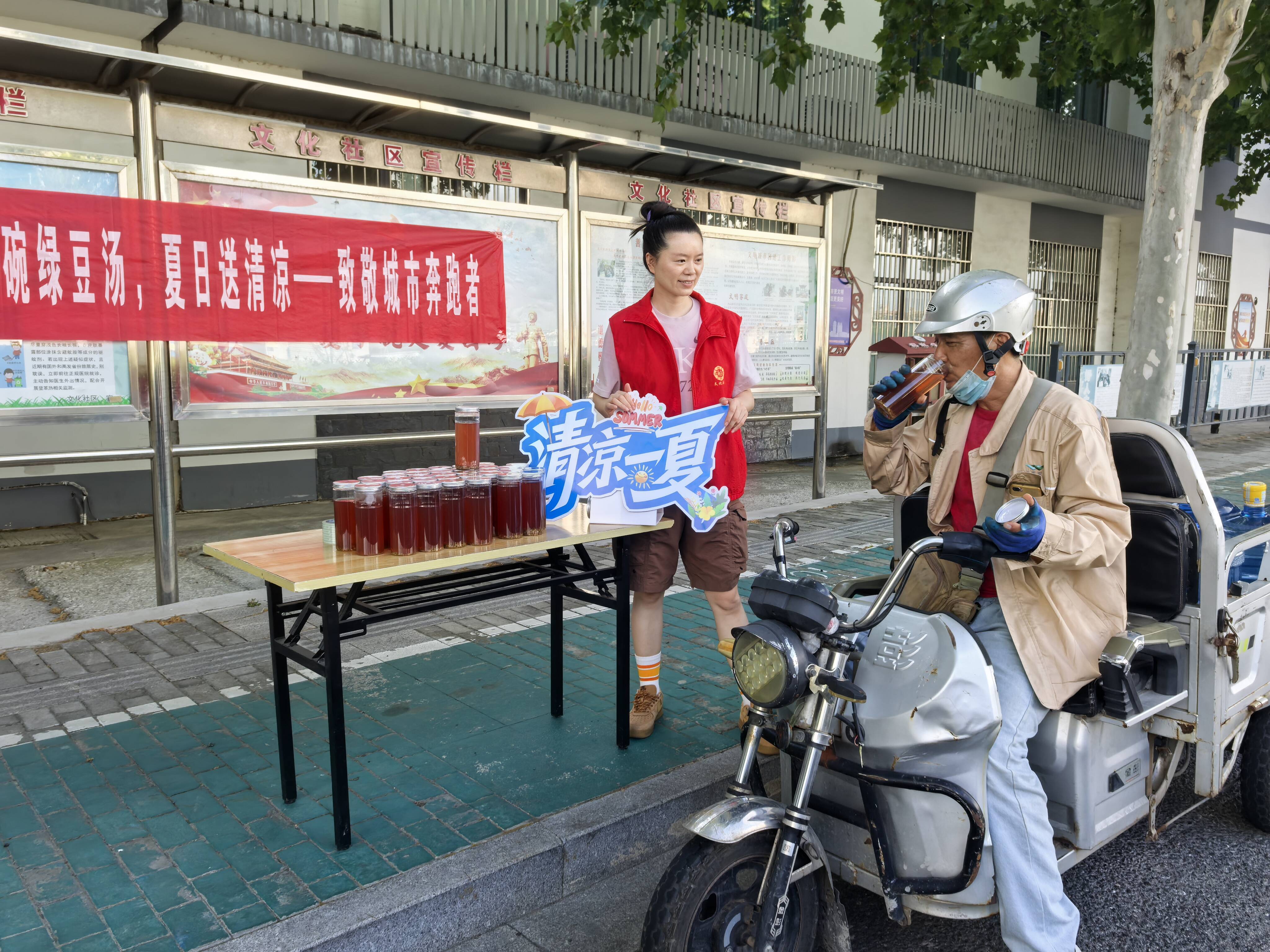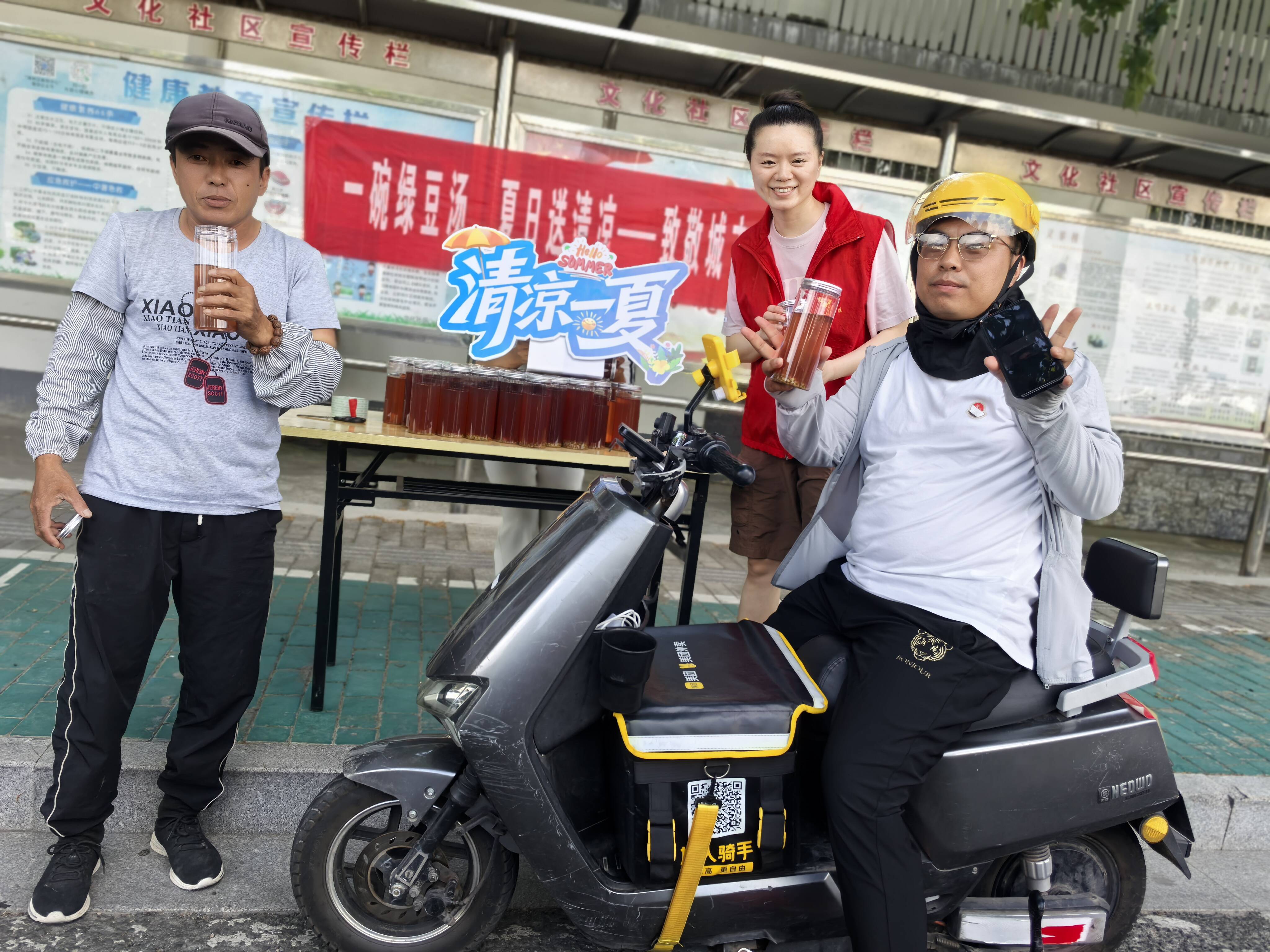 此次“一碗绿豆汤,夏日送清凉”活动,不仅为城市“奔跑者”们送去了夏日的清凉,更在他们与社区之间搭建起了一座温暖的连心桥。它如同一缕夏日里的清风,吹散了高温带来的炎热与疲惫,让这些在城市中辛勤奔波的人们感受到了来自社区大家庭的温暖与关怀,在炎炎夏日中留下了一段温馨而美好的回忆,也为城市的和谐发展增添了一抹亮丽的色彩。(通讯员:陈海燕)