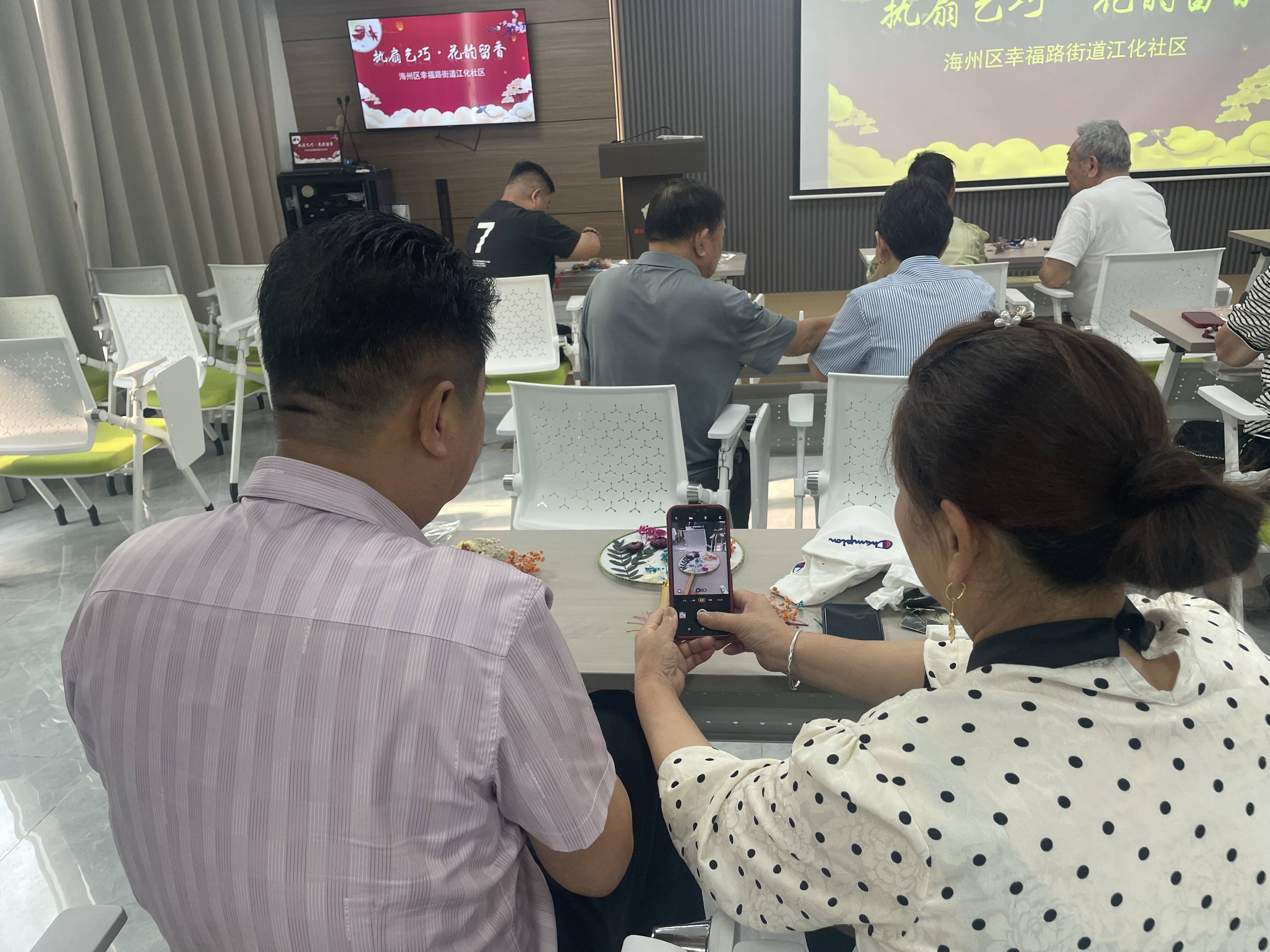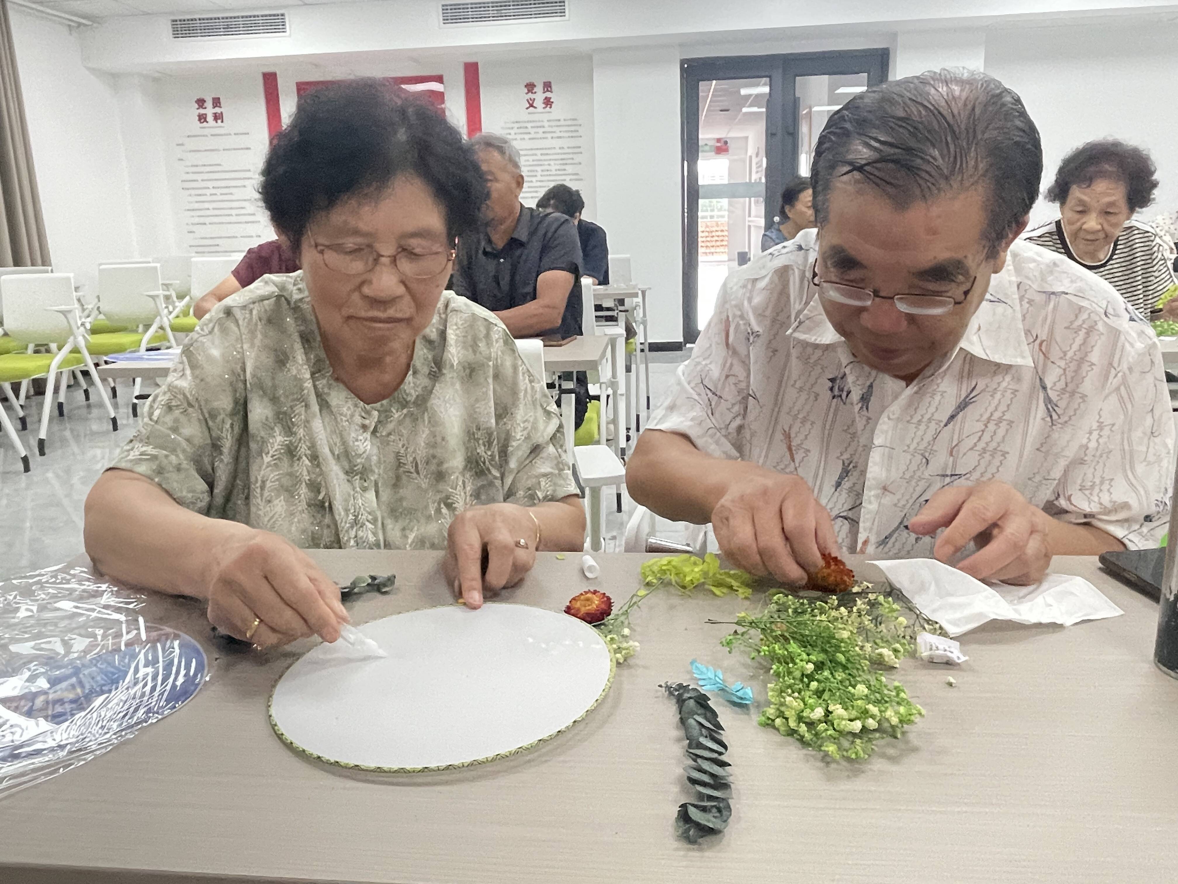 活动中,在社区志愿者的悉心协助下,居民们满怀兴致地投入到创作中,他们精心挑选干花材料,细心设计布局,相互交流借鉴,默契配合,将五彩斑斓的花瓣与枝叶一点点粘贴在素雅的团扇上,仿佛将彼此携手岁月的故事也封存于其中。不一会儿,一把把独具匠心、清新雅致的干花团扇便在巧手中诞生,每一把都承载着浓浓的情意与美好的祝福。