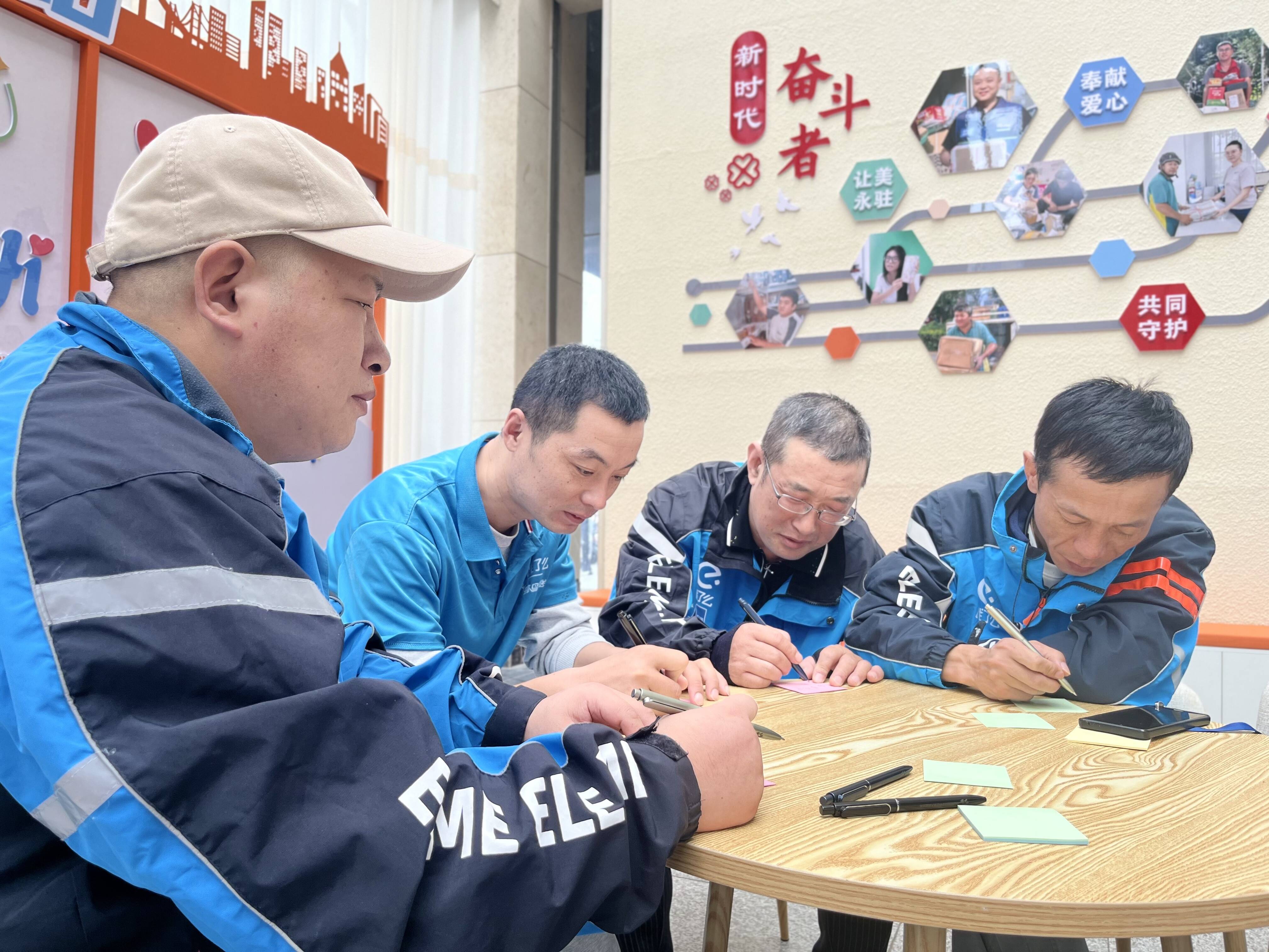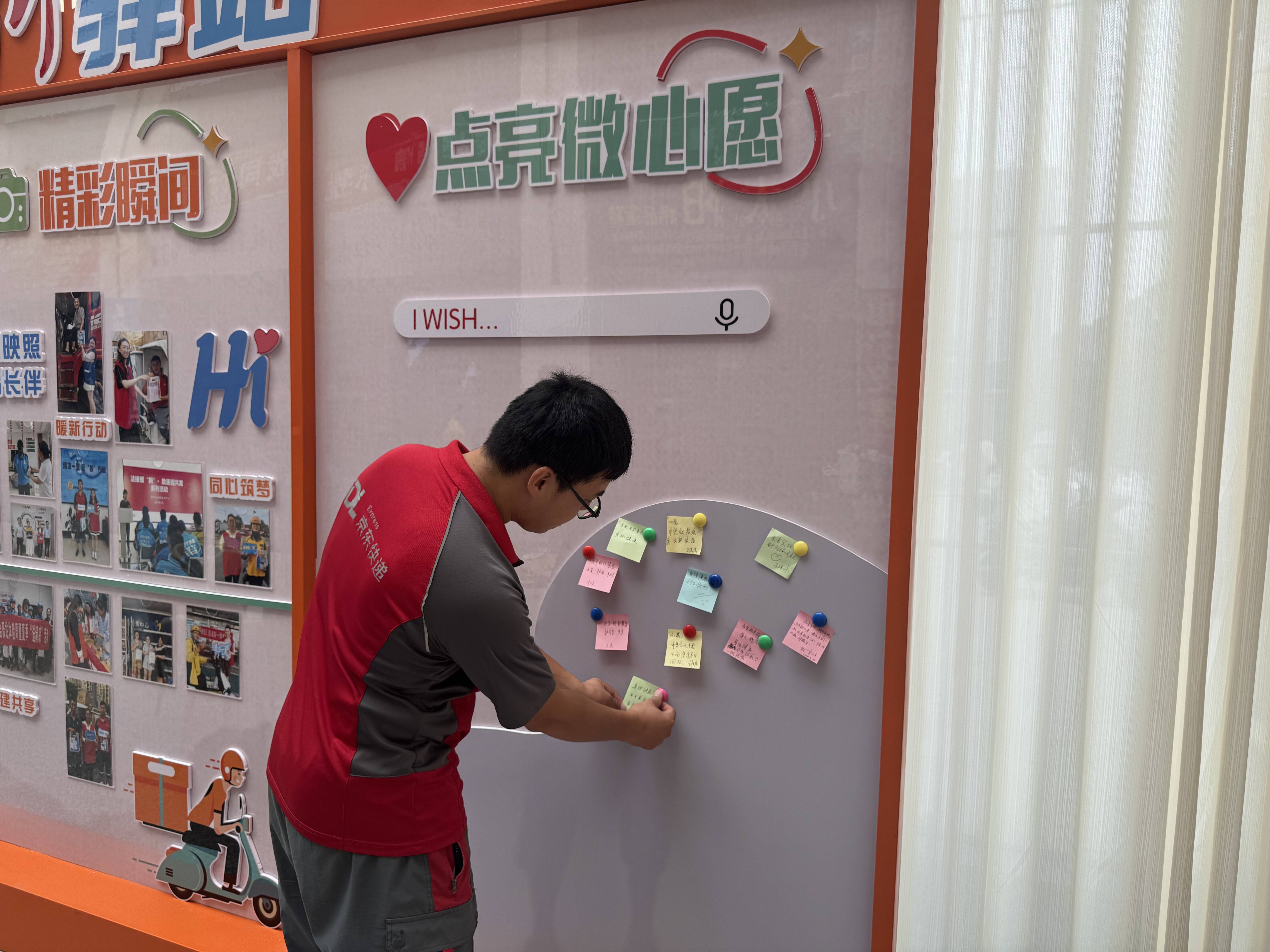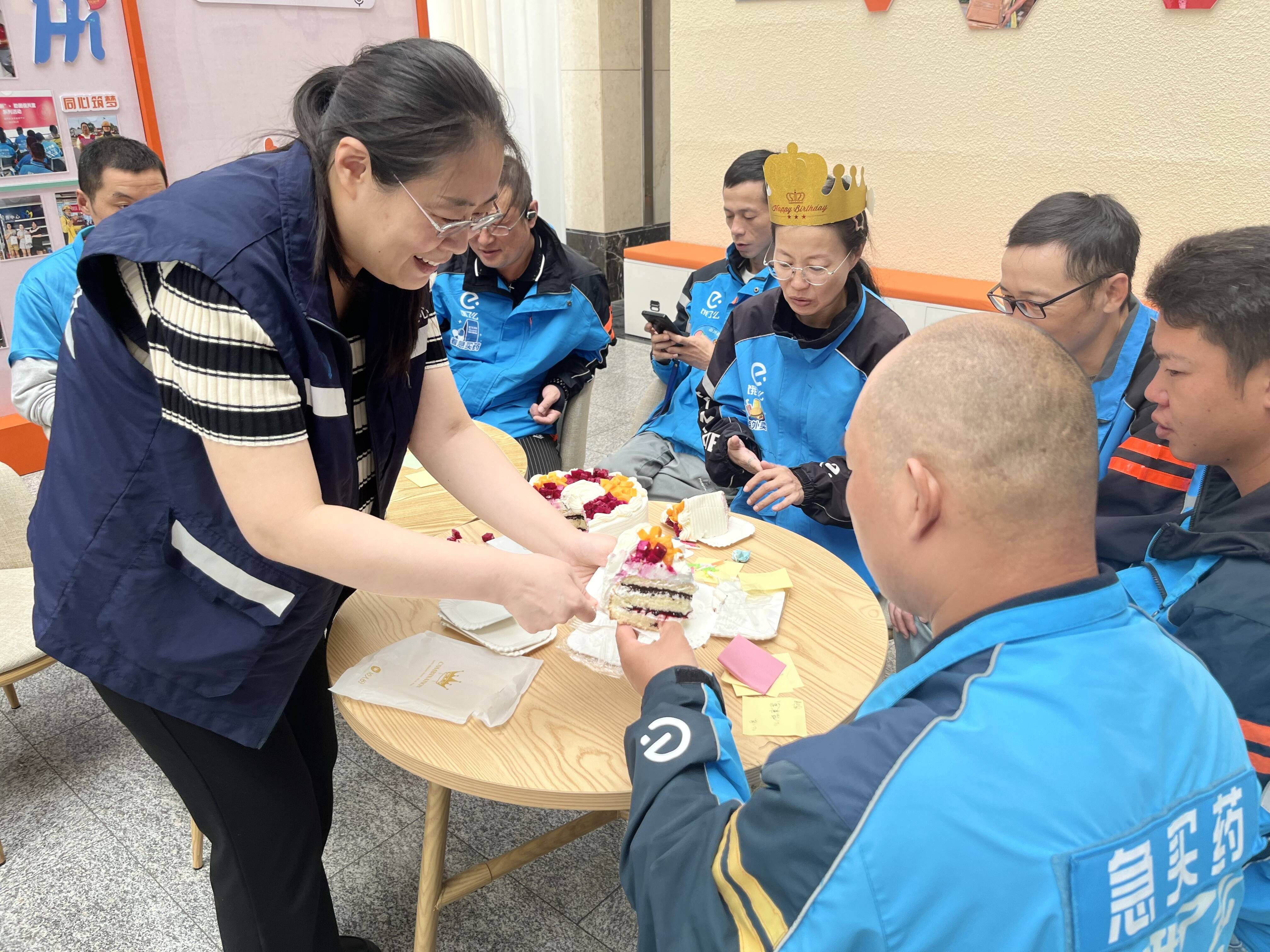 慰问环节之后,一场温馨别致的集体生日会将气氛推向高潮。社区党员志愿者一早便精心布置现场,以“骑士蓝”与“暖橙黄”为主色调,营造出轻松愉快的氛围。随着生日歌旋律响起,工作人员为“寿星”外卖员戴上生日帽、端上生日蛋糕,烛光映照着一张张平日里风雨兼程的面庞,此刻洋溢着幸福与松弛。大家共同许愿、切蛋糕、分享甜蜜,并在心愿墙上写下对未来的期盼。现场欢声笑语不断,劳动者们畅谈工作与生活,彼此之间的距离在温暖的互动中悄然拉近。