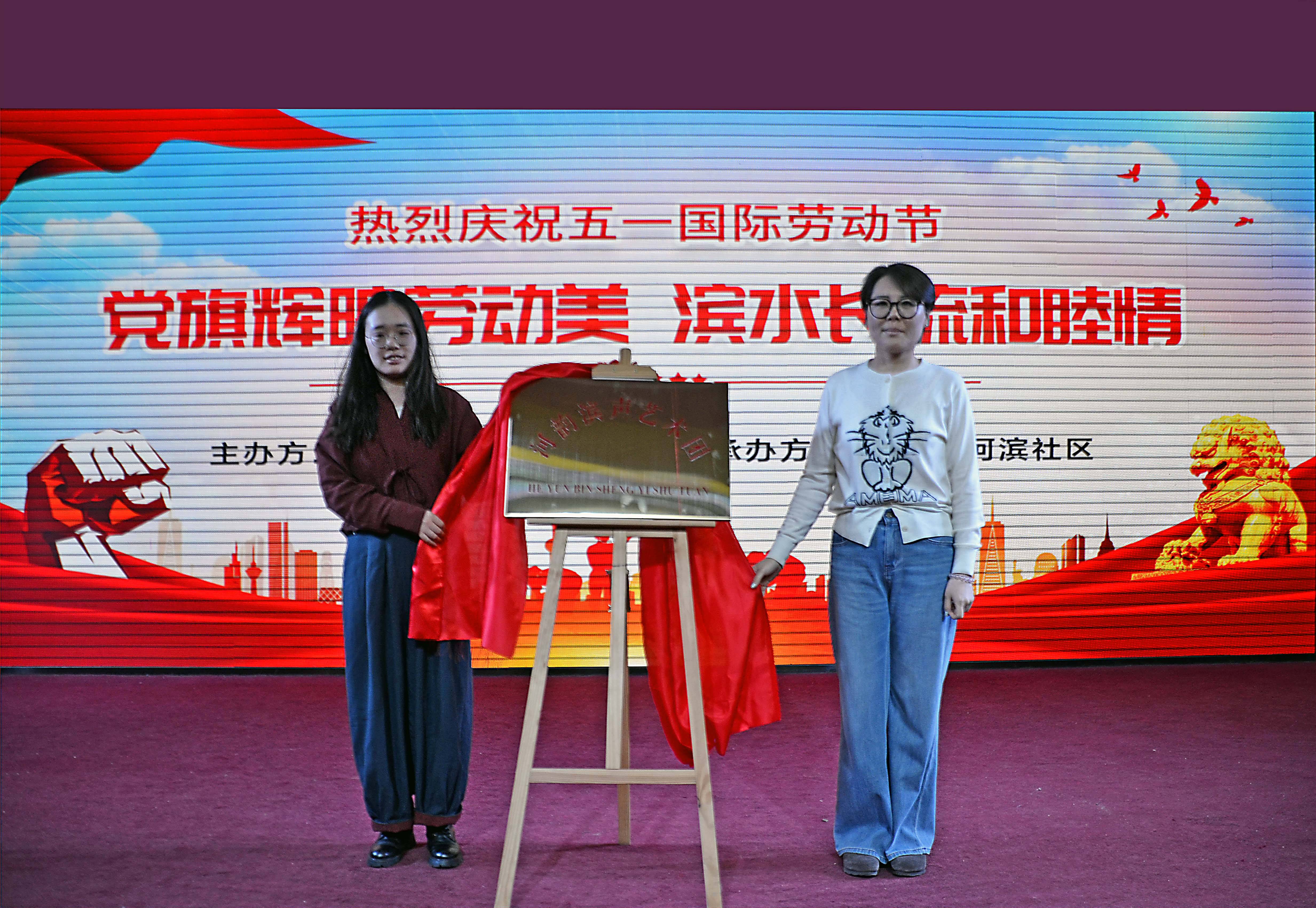 演出中,特别设置优秀劳动者表彰环节。郁洲街道办事处副主任王志轩揭晓名单,对物业人员、优秀商户志愿者等杰出代表进行表彰。他们坚守岗位、无私奉献,用实际行动诠释劳动精神,现场掌声雷动,向所有劳动者致以崇高敬意。值得一提的是,河滨社区文艺演出团队“河韵滨声艺术团”成立仪式同期举行。郁洲街道党工委副书记章婧与社区代表共同揭牌,标志着团队正式启航,未来将为社区文化建设注入新活力。