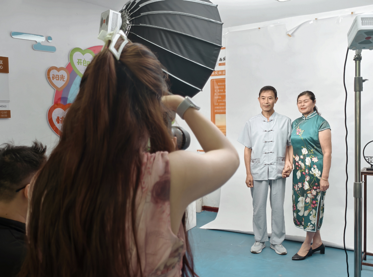 摄影区里,65岁的王阿姨在社区志愿者的协助下换上婚纱,整理裙摆时,老伴李叔叔主动上前帮她拂去肩头碎发。“结婚 35 年,当年就拍了张黑白登记照,今天总算圆了她的婚纱梦。” 李叔叔笑着说,眼神里满是宠溺。摄影师捕捉到两人相视一笑的瞬间,快门声响起,将这份跨越半生的默契与深情定格。现场不少夫妻都像他们这样,在镜头前分享着过往故事,留下一张张满含爱意的照片。