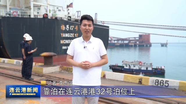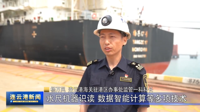 记者 李志强:我身后的大型散货船“扬子17号”轮满载大豆靠泊在连云港港32号泊位上,南京海关所属连云港海关关员正在岸边远程操控智能水尺观测船缓缓地靠近货轮,运用远程识读、数据智能计算等先进技术,快速准确地计算出货轮吃水情况。