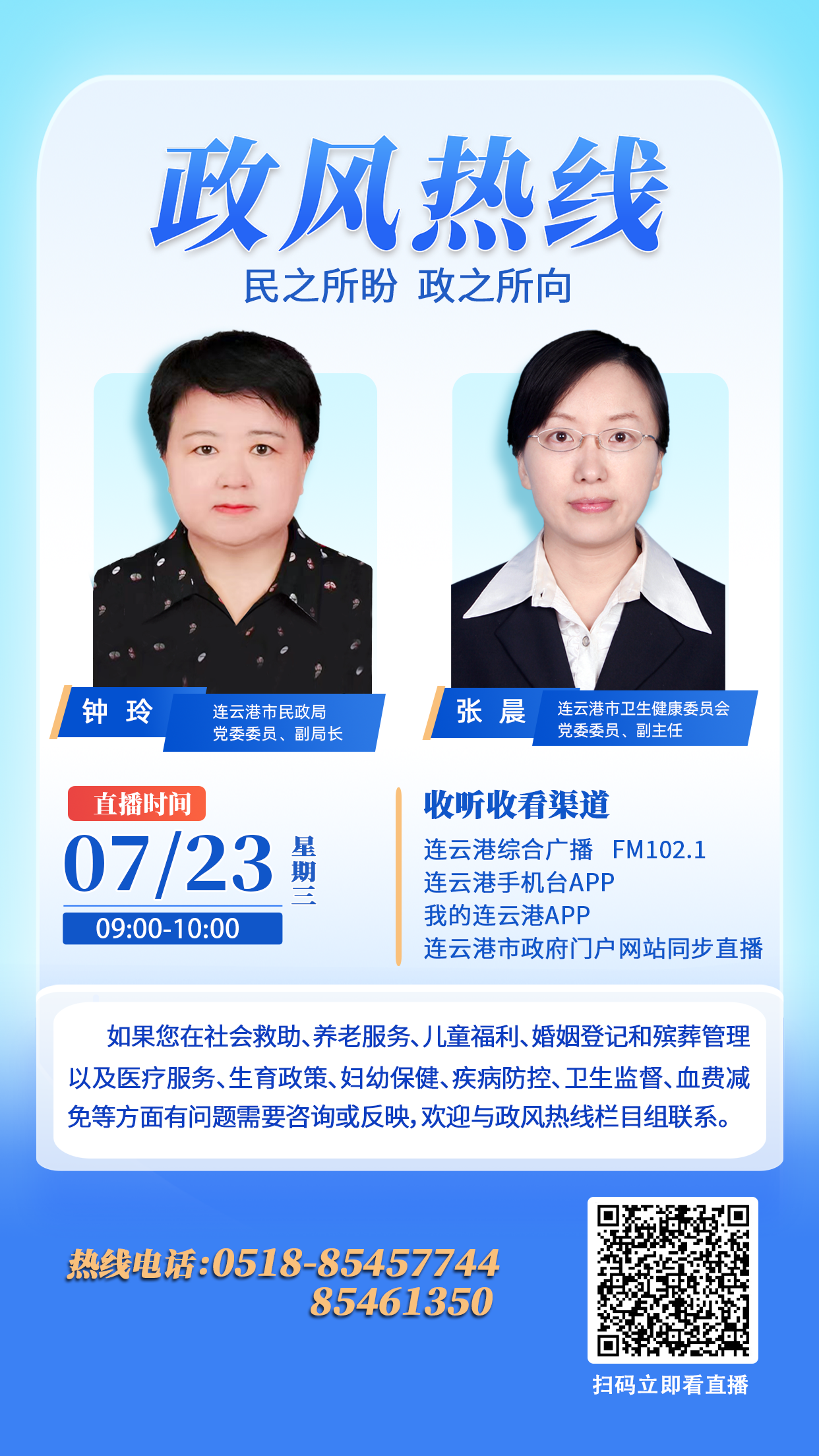 7月23日上午9点-10点,连云港市民政局党委委员、副局长钟玲、连云港市卫生健康委员会党委委员、副主任张晨将走进连云港《政风热线》直播间,如果您在社会救助、养老服务、儿童福利、婚姻登记和殡葬管理以及医疗服务、生育政策、妇幼保健、疾病防控、卫生监督、血费减免等方面有问题需要咨询或反映,欢迎与政风热线栏目组联系。可以拨打直播热线0518—85457744、85461350参与节目。