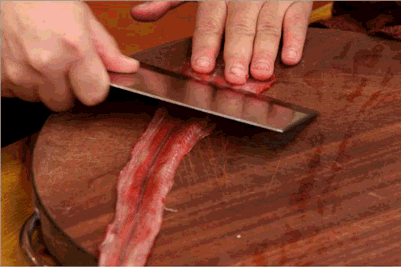 去骨的刀是特殊的刀,捉了活鳝鱼侧着钉好,只一刀从后颈扎进去,一路刨到尾巴尖尖,然后从颈部那一下切断骨头,却不能碰到肉。把刀抵在颈部骨头下面,再一路劈到头,把骨头和肉分离,骨头就去了。把内脏取出来,血水洗干净就好了。
