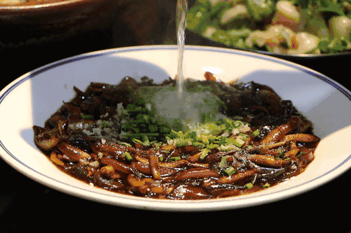 炒熟的鳝丝放入盘里,中间留出空间铺上葱花蒜末,浇上烧热的猪油,鳝丝葱花蒜末刺啦响,声音和香气便一起出来了。