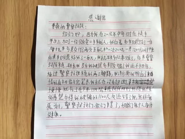 “11月4号,辛虎叔叔找到我跟我核实清楚后,将我被骗的1100元返给了我,我非常感谢。警察叔叔们,你们辛苦了,祝你们每个人身体健康!““人民卫士,一心为民”……
