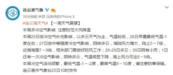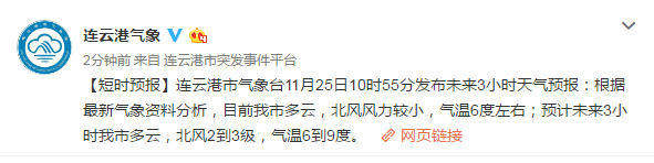 【短时预报】连云港市气象台11月25日10时55分发布未来3小时天气预报:根据最新气象资料分析,目前我市多云,北风风力较小,气温6度左右;预计未来3小时我市多云,北风2到3级,气温6到9度。你以为就这样了?明天会更冷