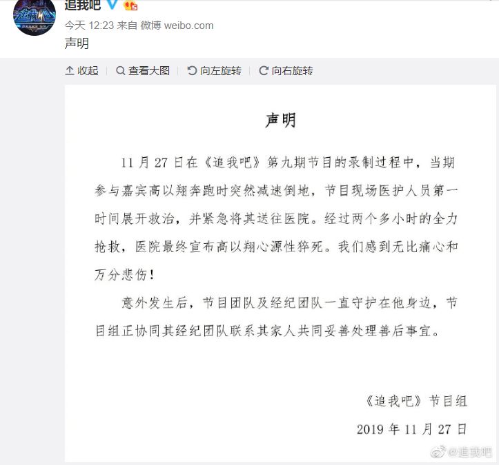 此前,《追我吧》节目组官方微博发声明宣布死亡原因,高以翔死因为心源性猝死。