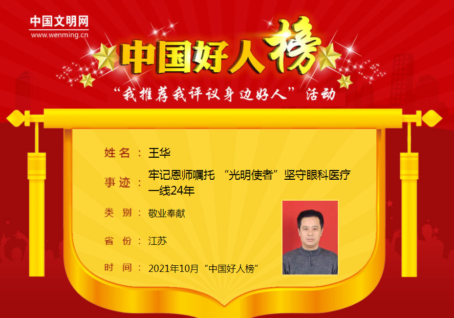 近日,中央文明办在四川达州发布2021年10月“中国好人榜”,全国各地100位(组)身边好人光荣上榜,江苏8人入选,连云港市眼科医院院长王华(牢记恩师嘱托 “光明使者”坚守眼科医疗一线24年)荣登榜单。
