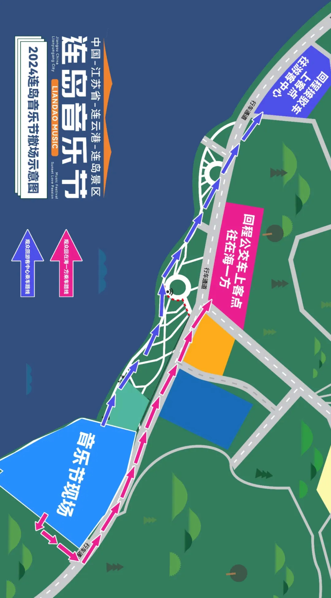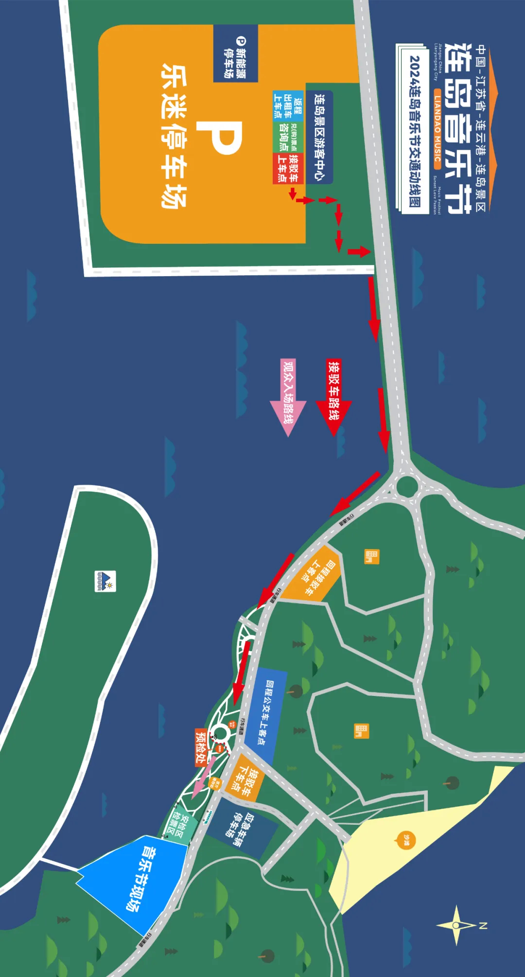 乐迷散场后需步行至连岛派出所停车场,由接驳车免费接送至游客中心。