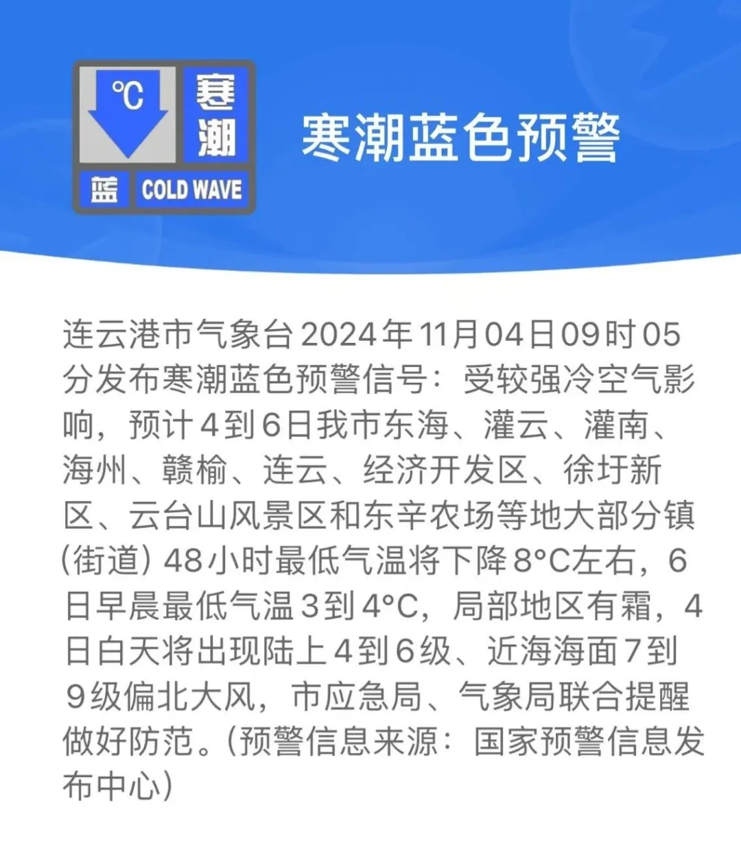 受较强冷空气影响,预计4到6日我市东海、灌云、灌南、海州、赣榆、连云、经济开发区、徐圩新区、云台山风景区和东辛农场等地大部分镇(街道)48小时最低气温将下降8℃左右,6日早晨最低气温3到4℃,局部地区有霜,4日白天将出现陆上4到6级、近海海面7到9级偏北大风,市应急局、气象局联合提醒做好防范。