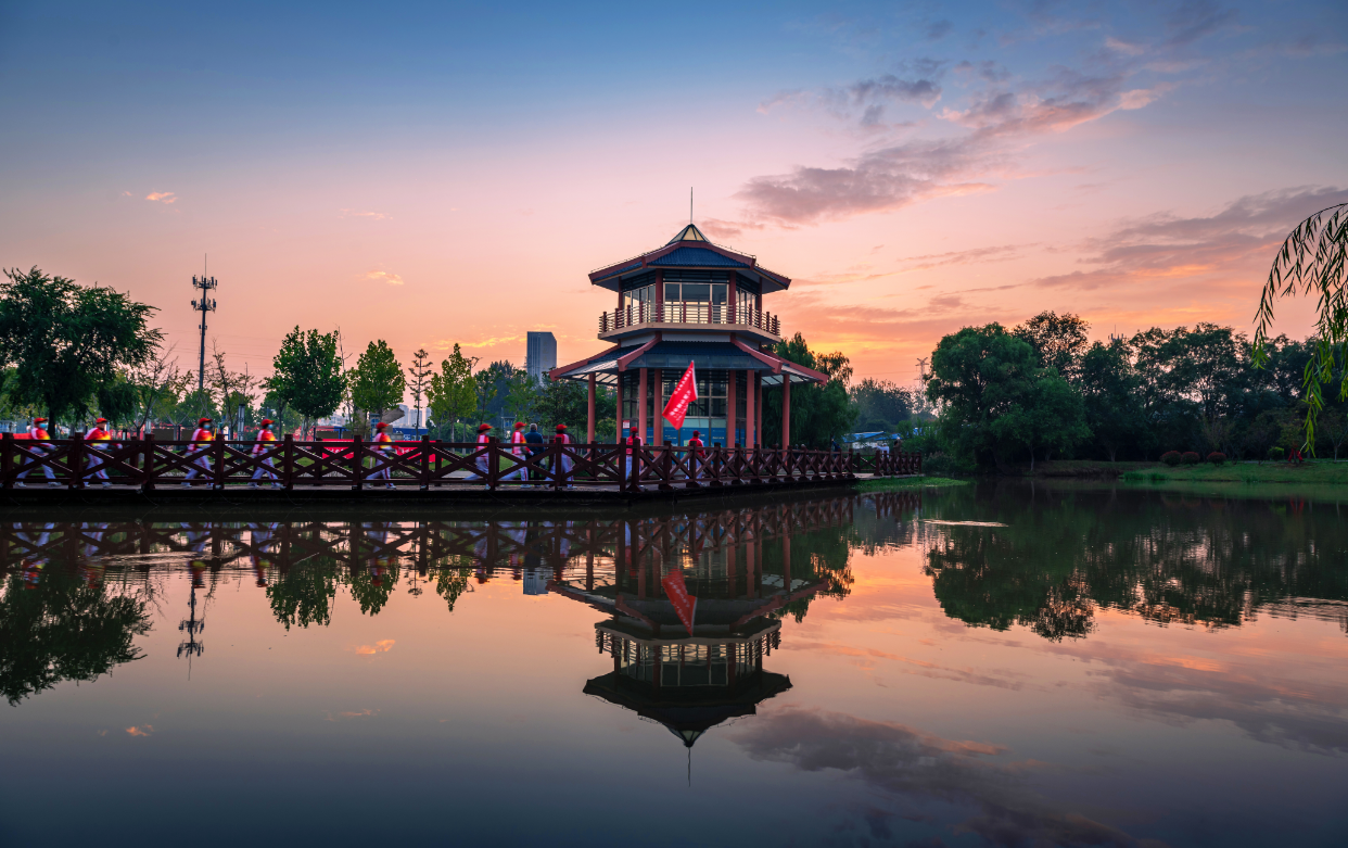 驿路花影相伴,止步在一座木亭下。远处歌舞升平,楼阁灯光如苍穹繁星。而我在的朐园安静得如世外桃源。