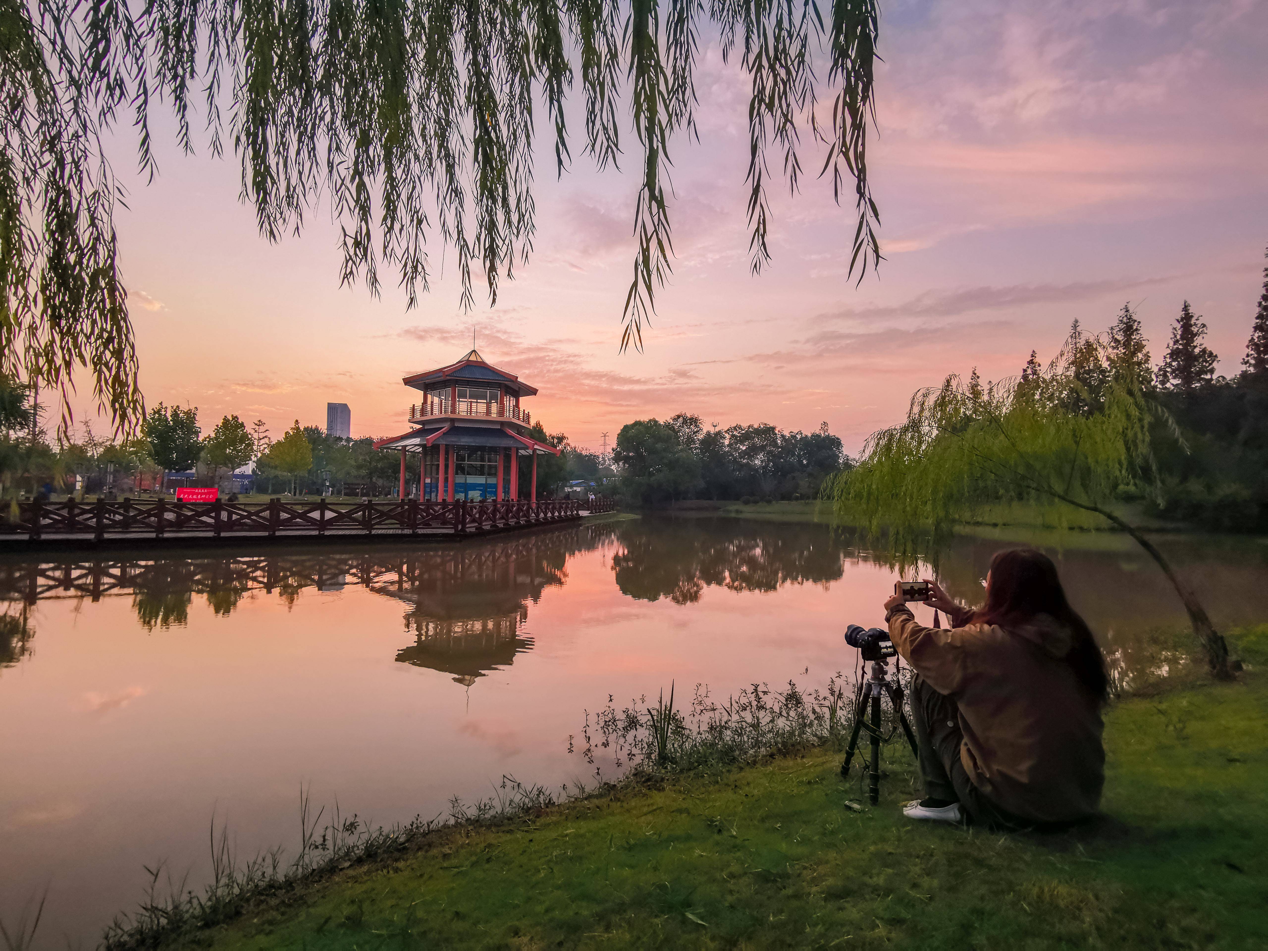 在湖中亭里静享了一会梦里听雨,起身继续随路而行。似乎园内的草草木木都与我呼吸与共,于是欣欣然暗暗筹划待到秋色时,一定再来此处,也学“采菊东篱下,悠然见南山”那样超然物外。