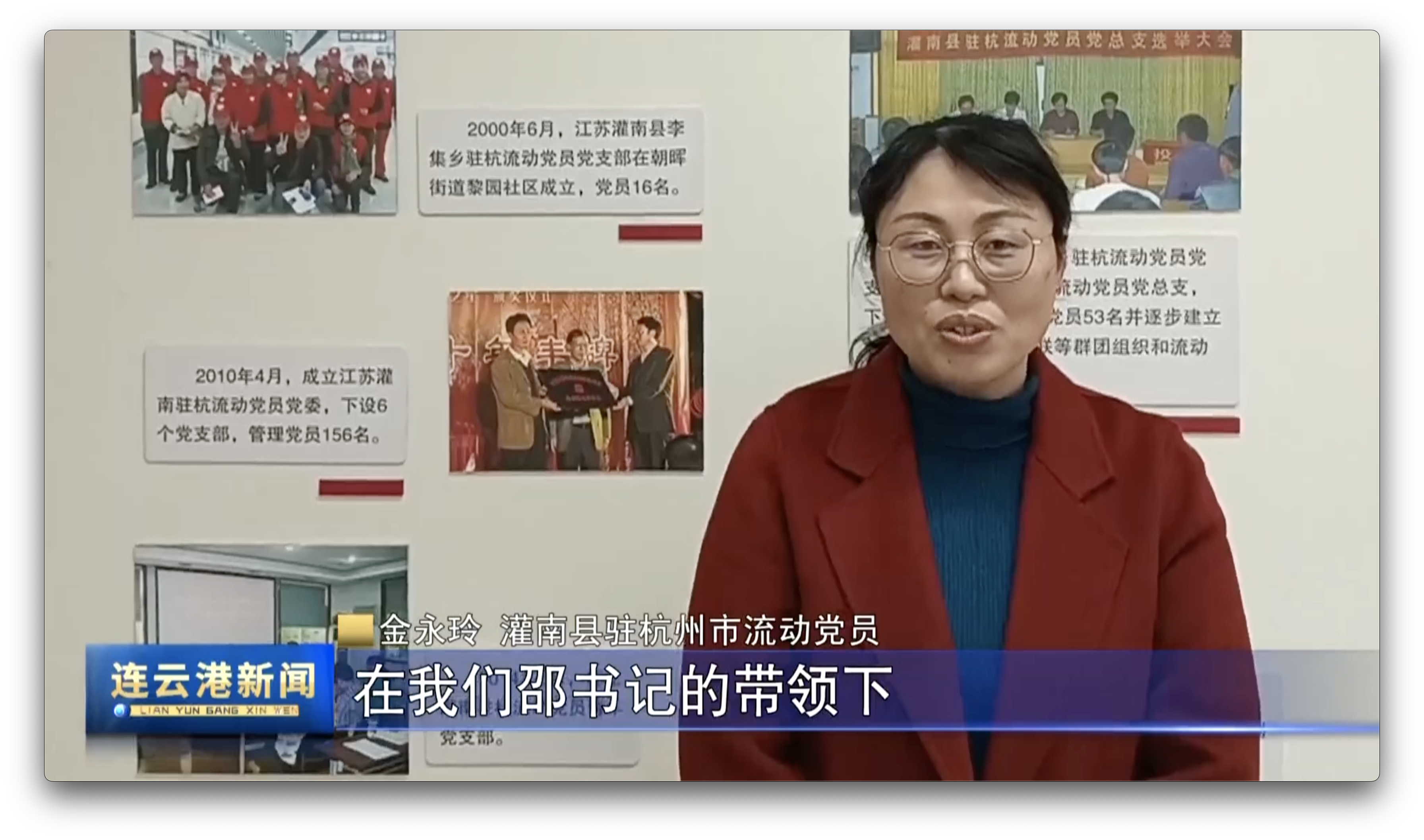 灌南县驻杭州市流动党员 金永玲说到,在我们邵书记的带领下,我们在外打工的党员就像在家一样,可以参加党员学习、党支部活动,可以在一起说说家乡话,有一种在家的氛围,我们非常踏实。