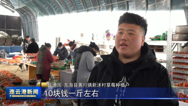 耿通国 东海县黄川镇新沭村草莓种植户:我们家草莓从11月份开始上市的,现在每天能采收500斤,10块钱一斤左右。