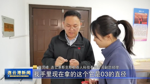 商贤峰 连云港斯克斯机器人科技有限公司副总经理:我手里现在拿的这个它是03的,直径01的导程,就是电机旋转一圈,螺母就会行走1毫米,那这款产品就是我们目前在跟哈工大合作研发的人形机器人灵巧手上使用的滚珠丝杠副。我们也是国内第一家具备设计开发以及生产和批量化生产的能力的一个公司。