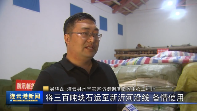 吴晓磊 灌云县水旱灾害防御调度指挥中心工程师:我县(防汛)抢险队员全部出动,并调动两台装甲车,三台挖机,十台自卸卡车,将300吨块石运至新沂河沿线,备情使用。
