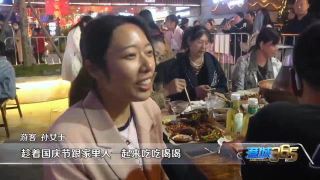 游客 孙女士:很开心,趁着国庆节跟家里人一起来吃吃喝喝,还能看看表演,因为平时上班没有时间,国庆节正好一起都放假,出来玩玩。