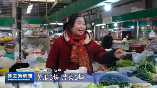 徐井荣 蔬菜摊主:韭菜理好的5块、黄瓜3块、芹菜3块、西红柿4块。豆腐都不涨价,年前到二十七八,能涨一点,涨几毛钱也涨不多,主要不下雨不下雪不会涨价的,什么都有,主要想吃的都有。