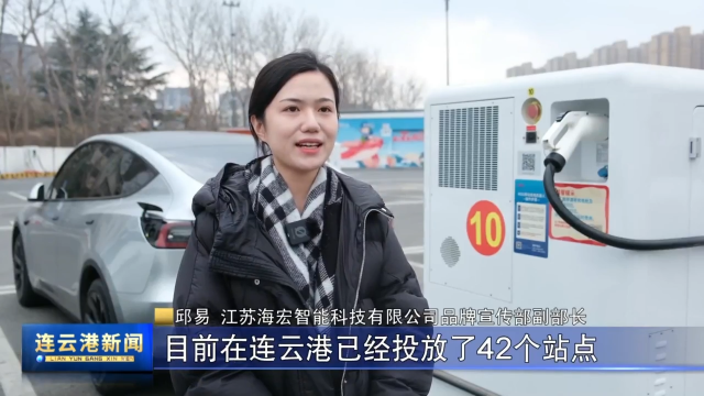 邱易 江苏海宏智能科技有限公司品牌宣传部副部长:我们的移动充电机器人目前在连云港已经投放了 42 个站点,目前已经覆盖连云港地区的多个加油站和小区停车场等多个场景。同时又在连霍、沈海、京沪等多个服务区多方位部署,将全力保障春运期间新能源车主们的出行方便。