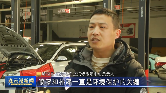 东海县车杰汽修钣喷中心负责人 谭恒昌:汽车行业中,喷漆和补漆是一直是环境保护的关键,为此我们投入大量物力财力对以前设备全新升级,建成一个全新水性漆的钣喷中心,首先从油漆的选择到干磨设备更新上,实现无尘干磨工艺,还有烤漆房升级安装光养催化设备实现达标排放,将污染降到最低。