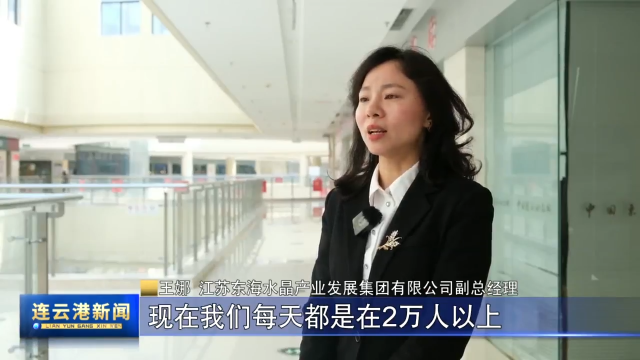 王娜 江苏东海水晶产业发展集团有限公司副总经理:去年我们东海水晶的销售额是460亿,像今年一季度就是已经达到了 110 亿,较去年同期增长了10%,现在我们每天都是在2万人以上,这样一直从3月初一直持续到现在,一直我们每天的流量居高不下。
