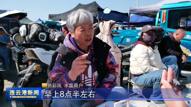 顾彩凤 水晶摊主:早上 8 点半左右,要到晚上一两点。他们都是发朋友圈,卖得特别好。那些小丫头小伙子太多了,全国各地每天都有,他们都是来直接就配这些货。