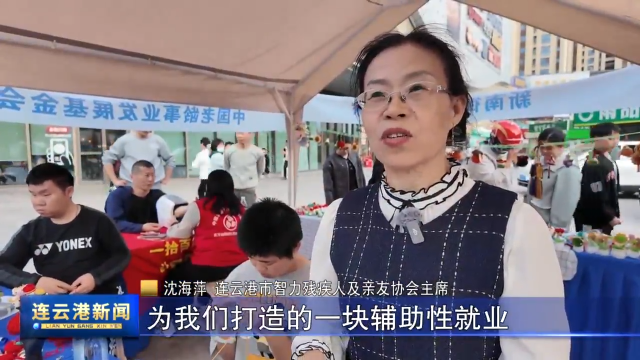 沈海萍 连云港市智力残疾人及亲友协会主席: 我们这是市残联专门为我们打造的一块辅助性就业,为我们打造了非遗助残工作室,经常在工作室里为残疾孩子和亲友,教会他们编织技艺,让他们通过这个技艺居家灵活就业,把指尖技艺变成指尖经济。