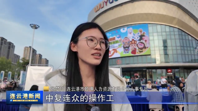 张梦凡 连云港市乾坤人力资源有限公司人事专员:我们家现在主要招聘中复连众的操作工,薪资在6500到1.2万一个月,第二个岗位是鑫顺通材料有限公司的播报员薪资在4500元一个月。