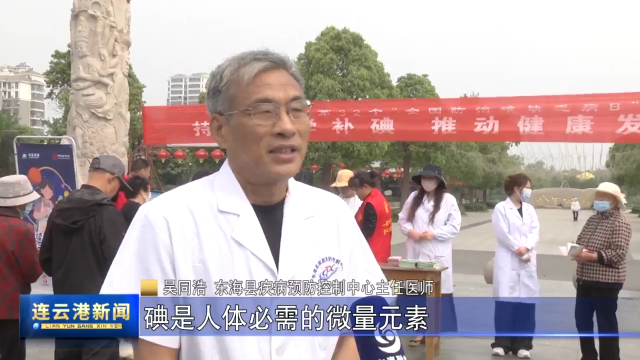 东海县疾病预防控制中心主任医师 吴同浩:碘是人体必需的微量元素,是维持机体正常功能,促进人体生长发育,特别神经系统发育的健康保障。缺碘会引起地方性甲状腺肿、地方性克汀病。我们想通过今天的宣传,让广大居民了解碘缺乏病的防治知识,请大家食用合格的碘盐,预防碘缺乏病发生。