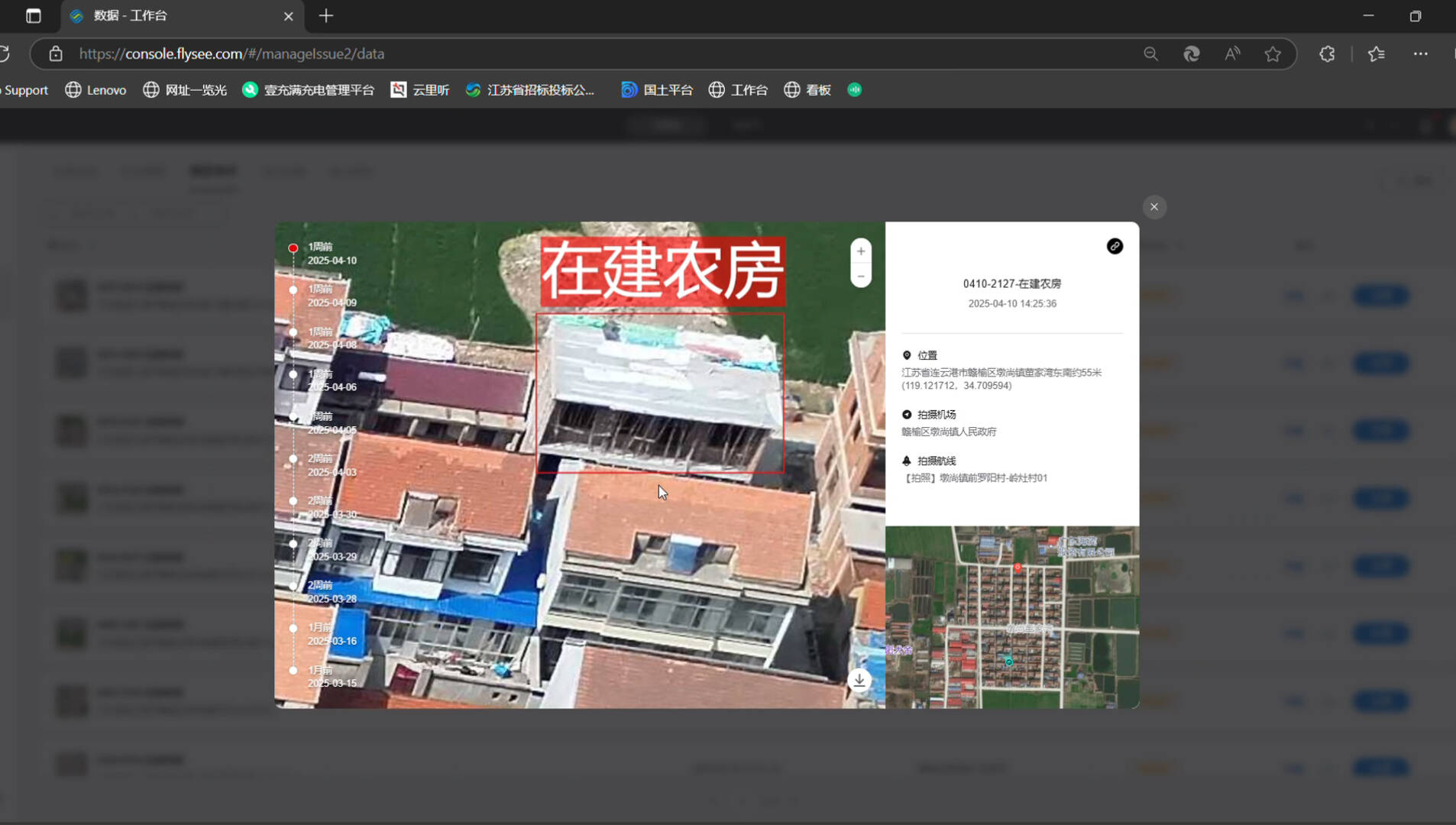徐斌 赣榆区墩尚镇综合行政执法和应急管理办公室负责人:过去我们控违巡检工作,依靠人力和车辆相结合,消耗了大量的时间与精力。现在我们引入平台之后,只需点开平台的新建任务,以罗阳村为例,框定好巡查范围,发现疑似违建行为,平台页面便会自动预警。经调查核实后,对确属违建的情况依法查处。