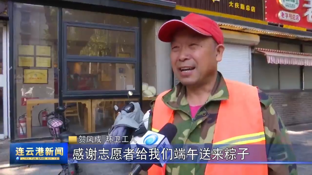 环卫工人 贺凤成:感谢志愿者给我们端午送来粽子,感到很温暖。