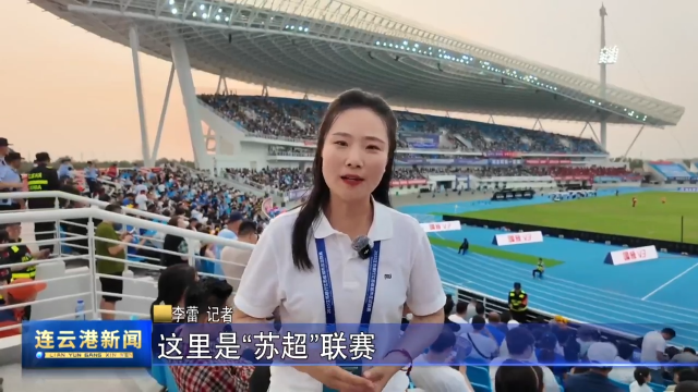 李蕾 记者:这里是苏超联赛连云港对战苏州的比赛现场,此时双方队员正在热身,而现在,我们的赛场上正在进行一个暖场,看台上早已经是座无虚席了。现在距离开赛还有30分钟,但是球迷的热情已经彻底点燃了整个的球场,连云港队身着标志性的蓝色战袍,而苏州队则一身红色的球衣,今晚注定是一场红蓝对决的激情碰撞。