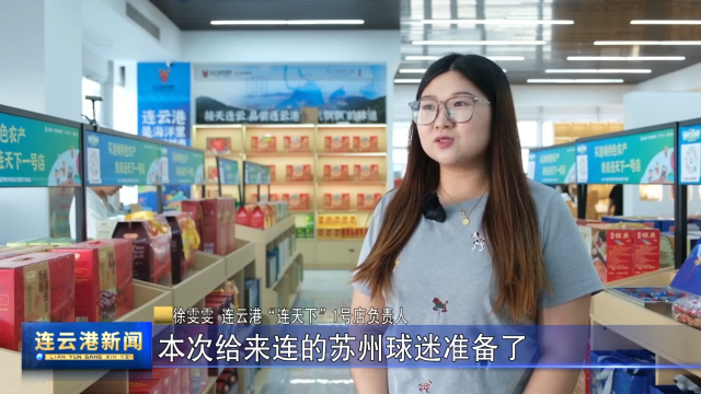 连云港“连天下”1号店负责人 徐雯雯:本次给来连的苏州球迷准备了免费的“连天下”特产大礼包,同时店内有百余款的连云港特产供大家选购,并对苏州的球迷有专属的折扣。通过本次的“连”味“轰炸”,让更多的苏州球迷了解连云港,关注连云港,品尝连云港的味道。