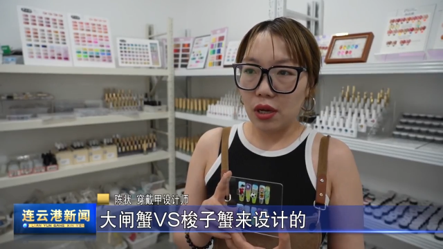 穿戴甲设计师 陈状:我的这个作品是根据现在的一些网络梗,苏哥VS十三妹、大闸蟹VS梭子蟹来设计的,我看到周边一些文创产品,比如说常州的玩偶,所以我就想到了我们连云港有一些文创产品可以是我们东海的穿戴甲。