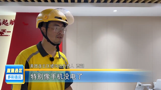 美团连云区墟沟站负责人 贾朔: 现在天气炎热的话,给我们提供水,还有降暑的物资之类,这种对我们有很大的帮助,特别像手机没电了,过来直接充电,而且还是不需要花钱,这种帮助非常大。